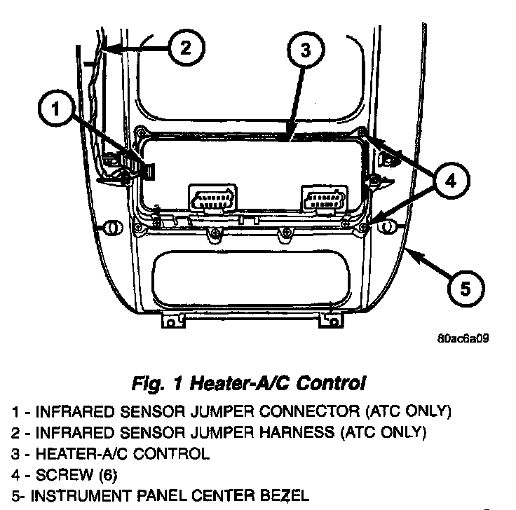4. If the vehicle is equipped with the optional Automatic Temperature Control (ATC) system, disconnect the infrared sensor jumper harness connector from the receptacle on the back of the heater-A/C control.
