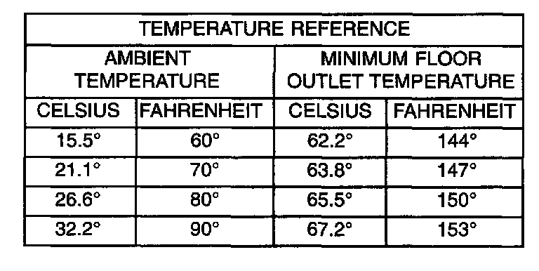 Engine coolant is provided to the heater system by two 16 mm (5/8 inch inside diameter) heater hoses. With the engine idling at normal running temperature, set the heater-A/C controls as follows. Temperature control to full Heat, Mode control to Floor, Blower control to the highest speed setting. Using a test thermometer, check the air temperature coming from the center floor outlets and compare this reading to the Temperature Reference table.
