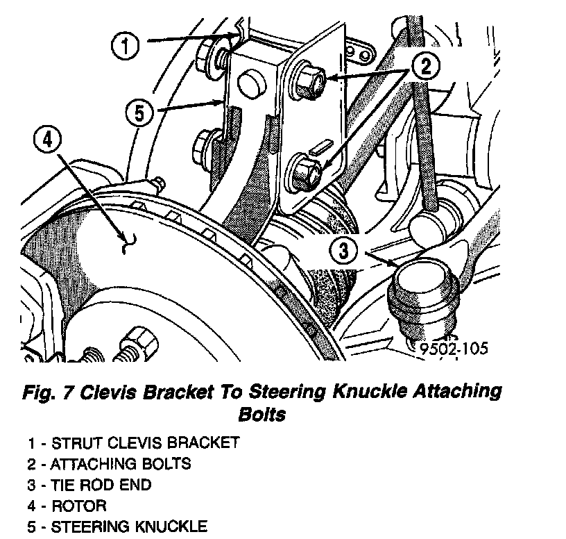 3. Remove the top and bottom, strut clevis bracket to steering knuckle attaching bolts and discard. Separate the steering knuckle from the strut clevis bracket and position steering knuckle so it is out of the way of the strut.