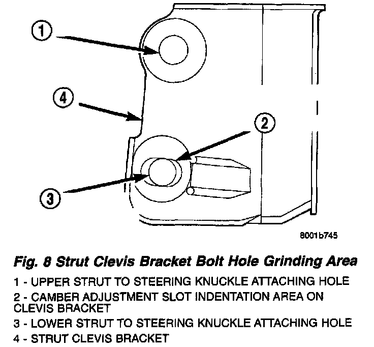 CAUTION: After slotting the strut clevis bracket hole, do not install the original attaching bolts when assembling the steering knuckle to the strut assembly. Only the flange bolts, cam bolts, and dog bone washers from the service package must be used to attach the steering knuckle to the strut after the mounting hole is slotted.