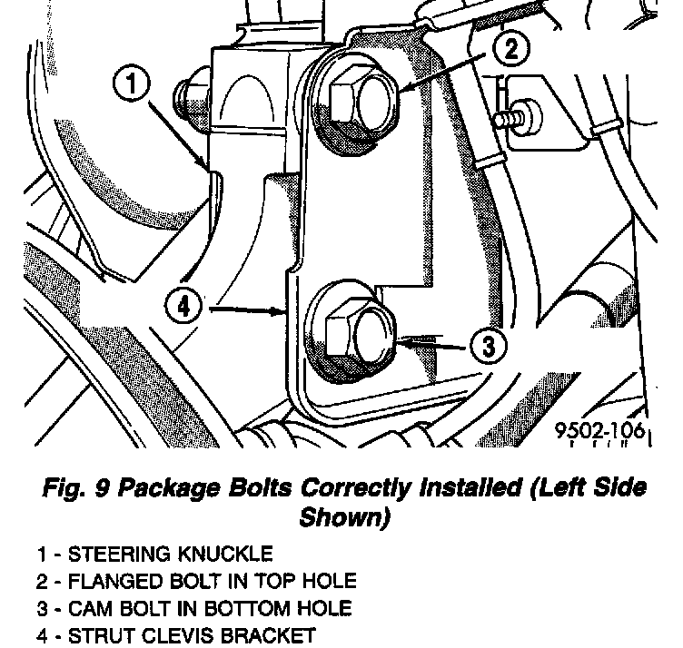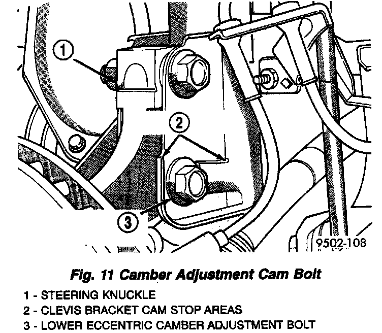 10. Adjust the front camber to the preferred setting by rotating the lower eccentric cam bolt against the cam stop areas on the strut clevis bracket. When camber is set, tighten the upper strut clevis bracket bolt and lower cam bolt. Again jounce front and rear of vehicle an equal amount of times and verify front camber setting. Torque both front strut to steering knuckle attaching bolts to 81 Nm (60 ft. lbs.) plus an additional 1/4 (90°) turn after the required torque is met.