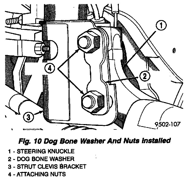 6. Install a dog bone washer on the steering knuckle to strut clevis bracket attaching bolts, then install the nuts onto the bolts from the service package. Tighten the bolts just enough to hold the steering knuckle in position when adjusting camber, while still allowing the steering knuckle to move in clevis bracket.