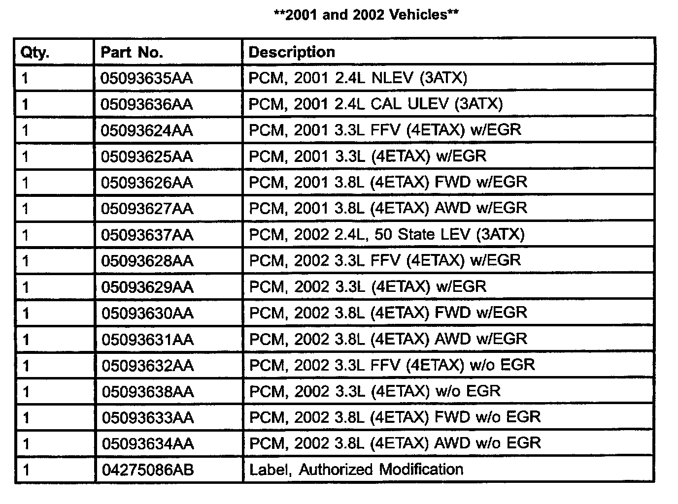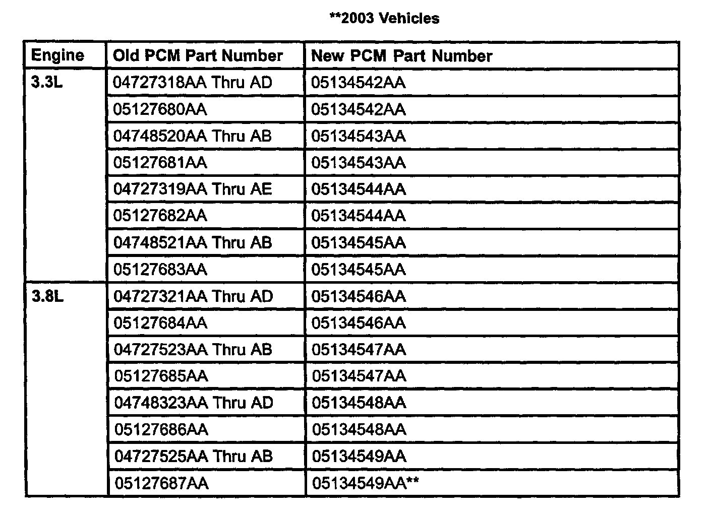 This bulletin applies to 2001 and 2002 vehicles equipped with a 2.4L, 3.3L and 3.8L engine (sales code EDZ, EGA, EGH or EGM), **and 2003 vehicles equipped with 3.3L and 3.8L engine (sales codes EGA, EGH or EGM).**
