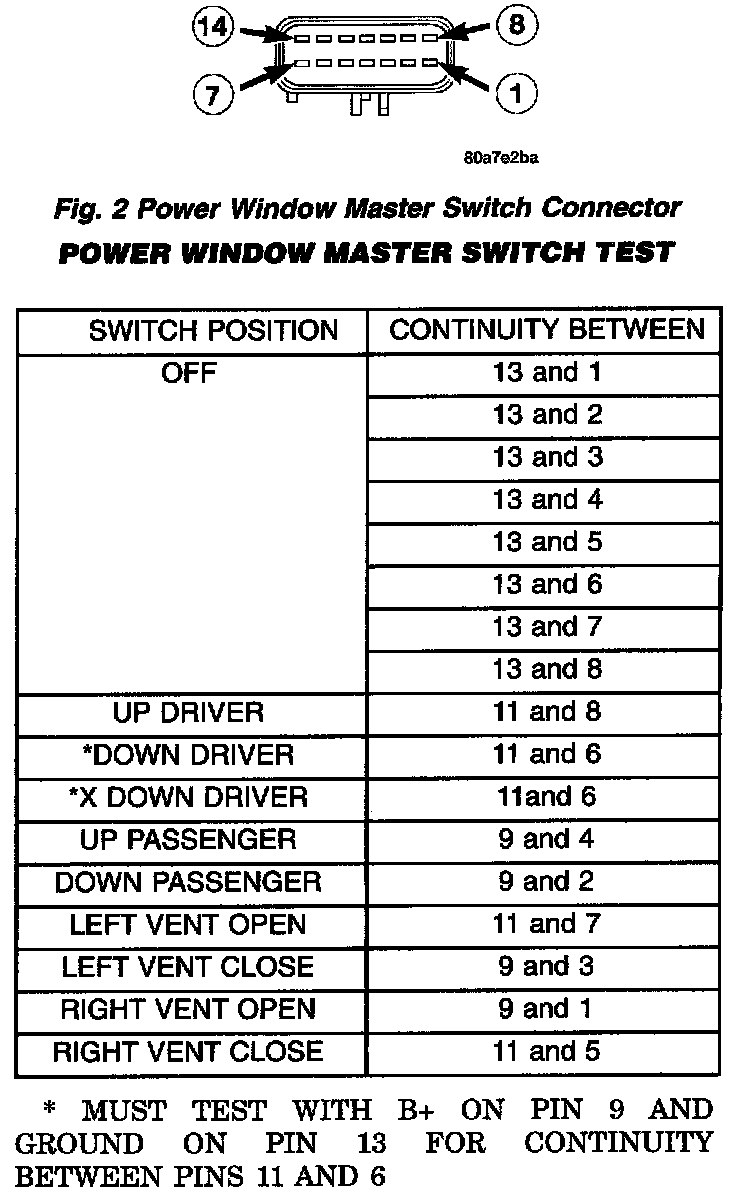 5. If the results are not OK, replace the switch. The power window master switch has a Auto-Down feature. The switch is equipped with two detent positions when actuating the power window OPEN. The first detent position allows the window to roll down and stop when the switch is released. The second detent position actuates an integral express roll down relay that rolls the window down after the switch is released. When the express down circuit senses stall current (window has reached end of down travel), the switch will turn current OFF to the motor. The AUTO feature can be cancelled by actuating the switch UP or DOWN while window is in motion. If the electronic circuit in the switch fails to detect a stall current, the auto down circuit will time out within 9 to 13 seconds.