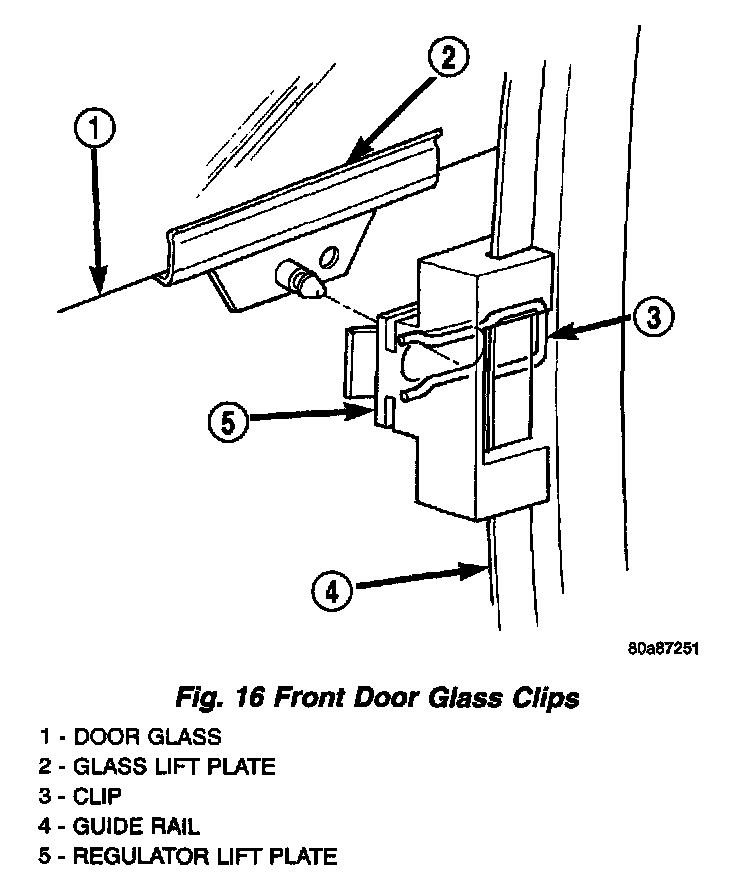 2. Remove door glass retaining clips and secure the window in the up position using masking tape or equivalent.