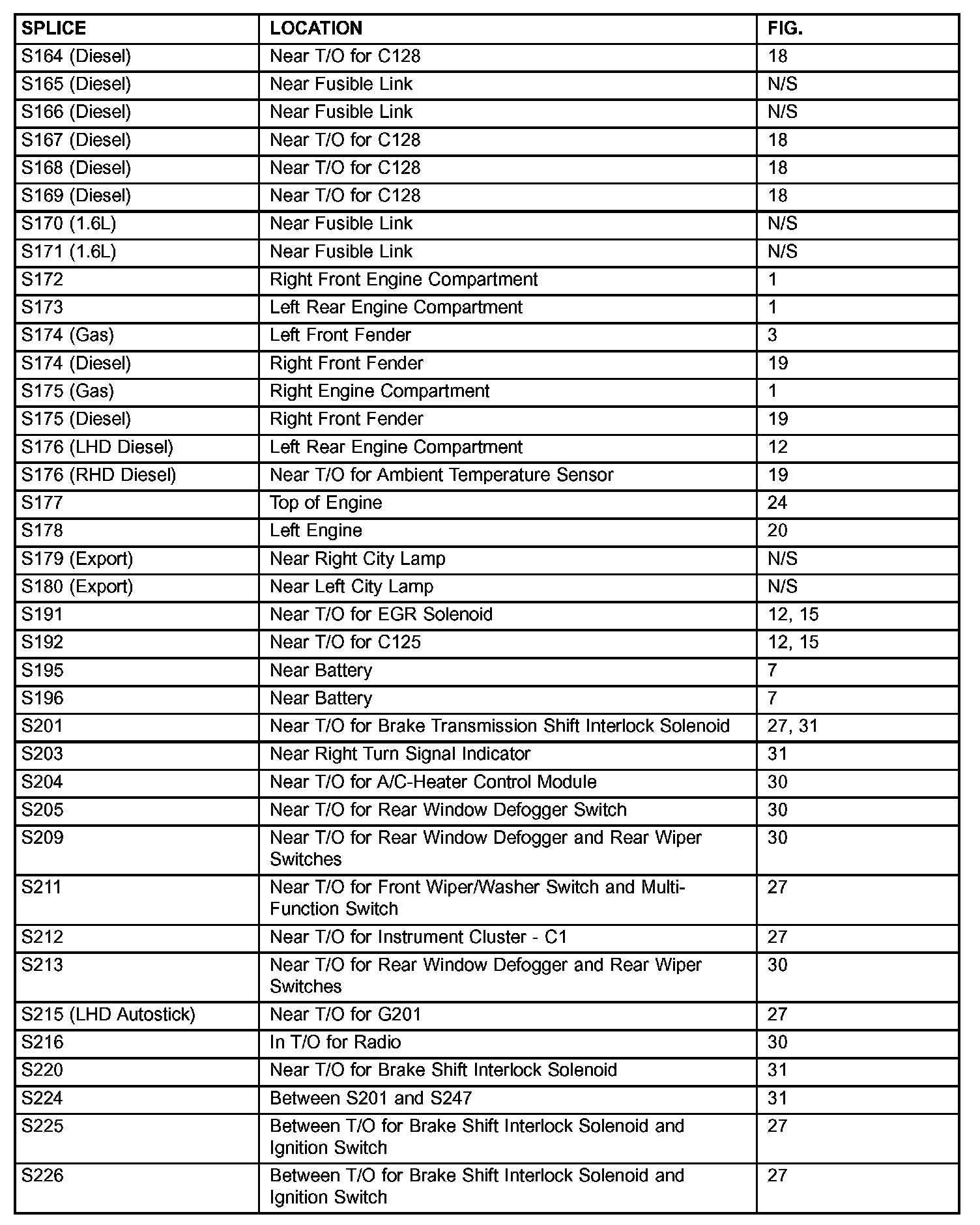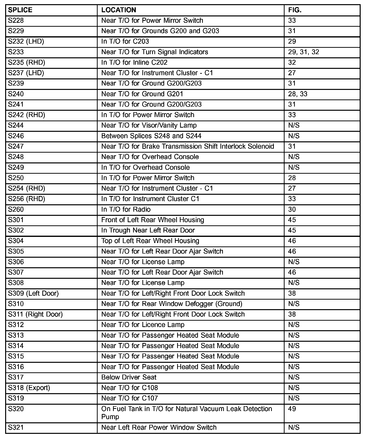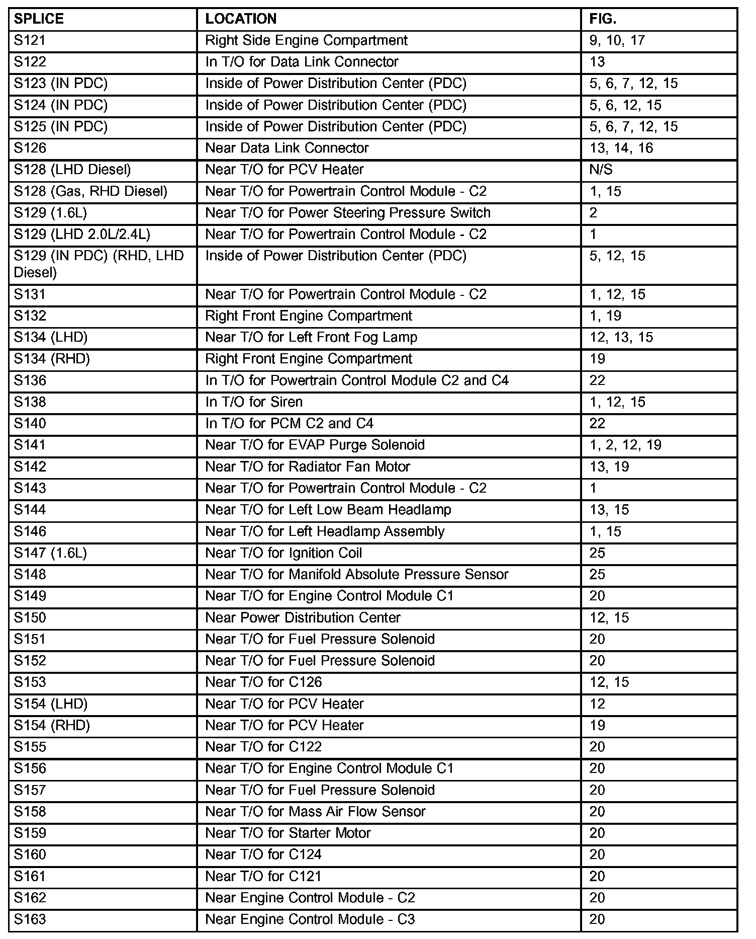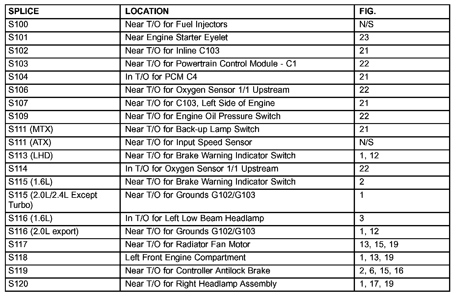 The abbreviation T/O (Take Out) is used in the location column to indicate a point in which the wiring harness branches out to a component.