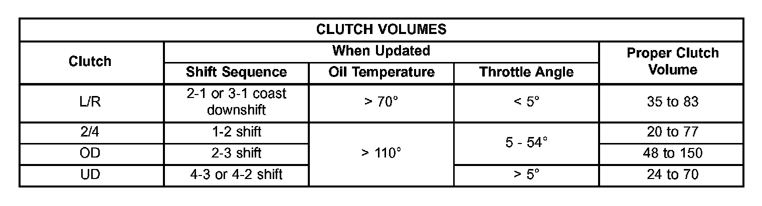 Certain mechanical problems within the clutch assemblies (broken return springs, out of position snap rings, excessive clutch pack clearance, improper assembly etc.) can cause inadequate or out-of-range clutch volumes. Also, defective Input/Output Speed Sensors and wiring can cause these conditions. The following chart identifies the appropriate clutch volumes and when they are monitored/updated: