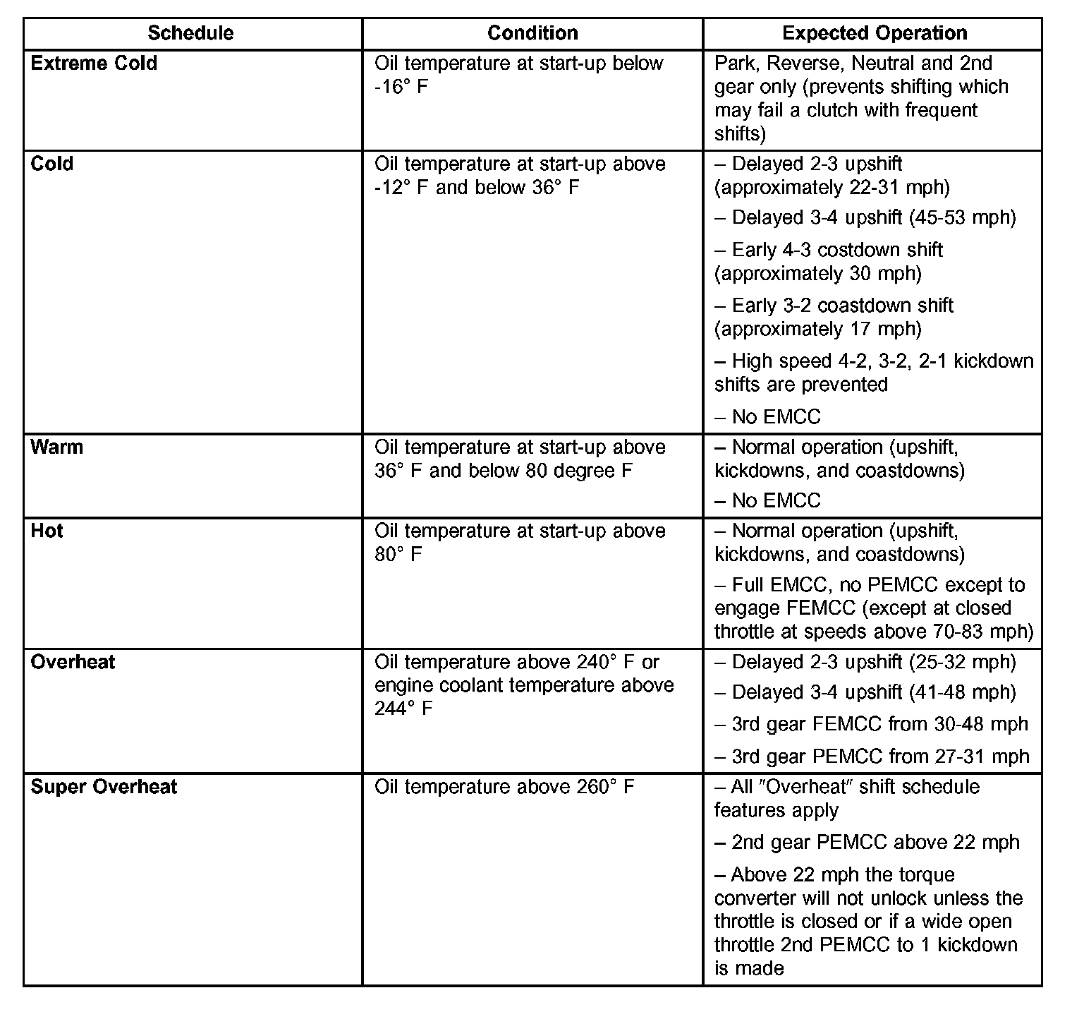 As driving conditions change, the PCM appropriately adjusts the shift schedule. Refer to the following chart to determine the appropriate operation expected, depending on driving conditions.