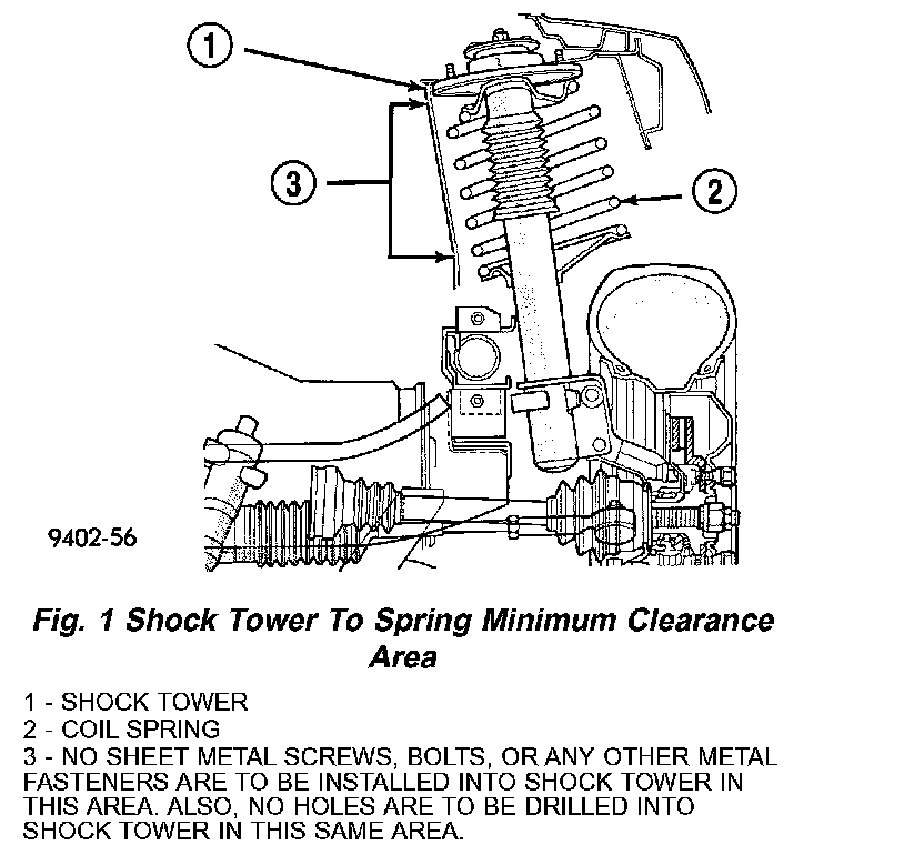 CAUTION: At no time when servicing a vehicle, can a sheet metal screw, bolt or other metal fastener be installed in the shock tower to take the place of an original plastic clip. Also, NO holes can be drilled into the front shock tower in the area shown in, for the installation of any metal fasteners into the shock tower. Because of the minimum clearance in this area, installation of metal fasteners could damage the coil spring coating and lead to a corrosion failure of the spring. If a plastic clip is missing, or is lost or broken during servicing a vehicle, replace only with the equivalent part listed in the Mopar parts catalog.
