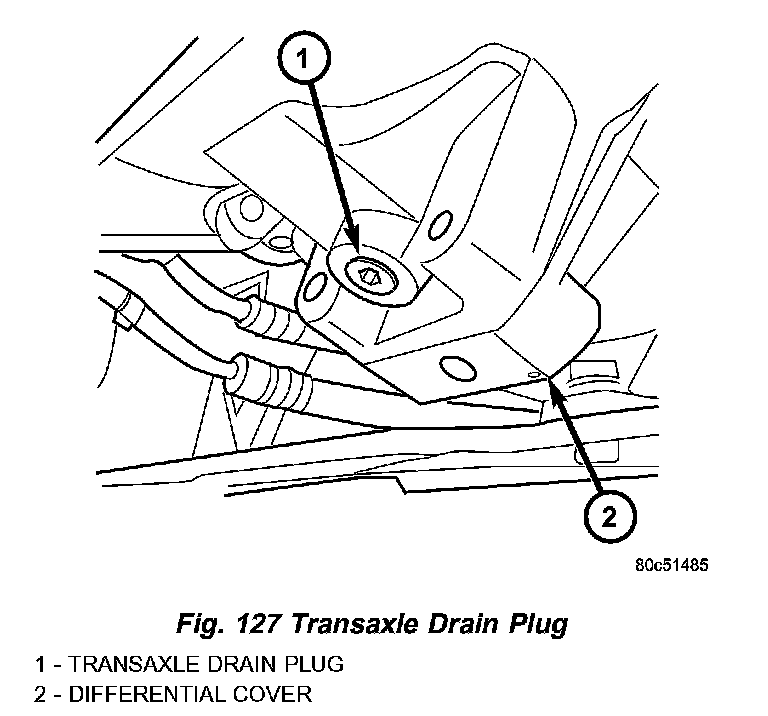 2. Remove transaxle drain plug (Fig. 127) and drain fluid into suitable container.