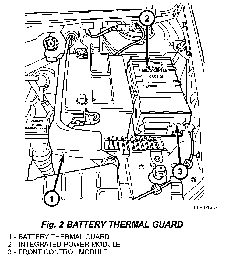 The Integrated Power Module (IPM) is a combination of the Power Distribution Center (PDC) and the Front Control Module (FCM). The IPM is located in the engine compartment, next to the battery on this model (Fig. 2). The power distribution center mates directly with the Front Control Module (FCM) to form the IPM Fuse and Relay Center. The power distribution center (PDC) is a printed circuit board based module that contains fuses and relays, while the front control module contains the electronics controlling the IPM and other functions. This IPM connects directly to the battery positive via a four pin connector. The ground connection is via two other connectors. The IPM provides the primary means of voltage distribution and protection for the entire vehicle.