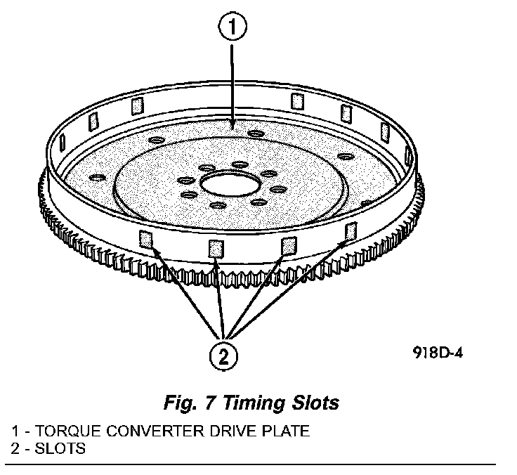 The crankshaft position sensor detects slots cut into the transmission driveplate extension. There are 3 sets of slots. Each set contains 4 slots, for a total of 12 slots. Basic timing is set by the position of the last slot in each group. Once the Powertrain Control Module (PCM) senses the last slot, it determines crankshaft position (which piston will next be at TDC) from the camshaft position sensor input. The 4 pulses generated by the crankshaft position sensor represent the 69°, 49°, 29°, and 9° BTDC marks. It may take the PCM one engine revolution to determine crankshaft position.