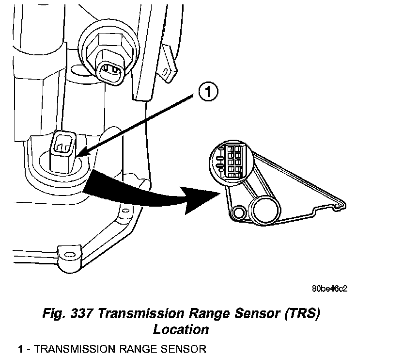The Transmission Range Sensor (TRS) is mounted to the top of the valve body inside the transaxle and can only be serviced by removing the valve body. The electrical connector extends through the transaxle case (Fig. 337).