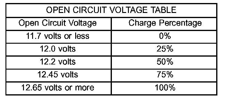See the Open-Circuit Voltage Table. This voltage reading will indicate the battery state-of-charge, but will not reveal its cranking capacity. If a battery has an open-circuit voltage reading of 12.4 volts or greater, it may be load tested to reveal its cranking capacity. Refer to Standard Procedures for the proper battery load test procedures.