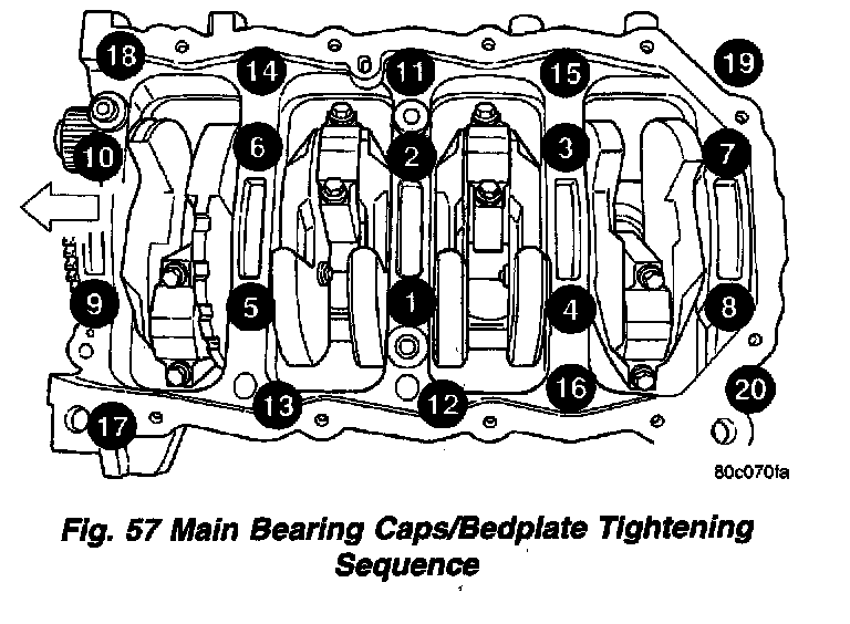 1. Install bolts 11, 17, and 20 finger tight. Tighten these bolts down together until the bedplate contacts the cylinder block.