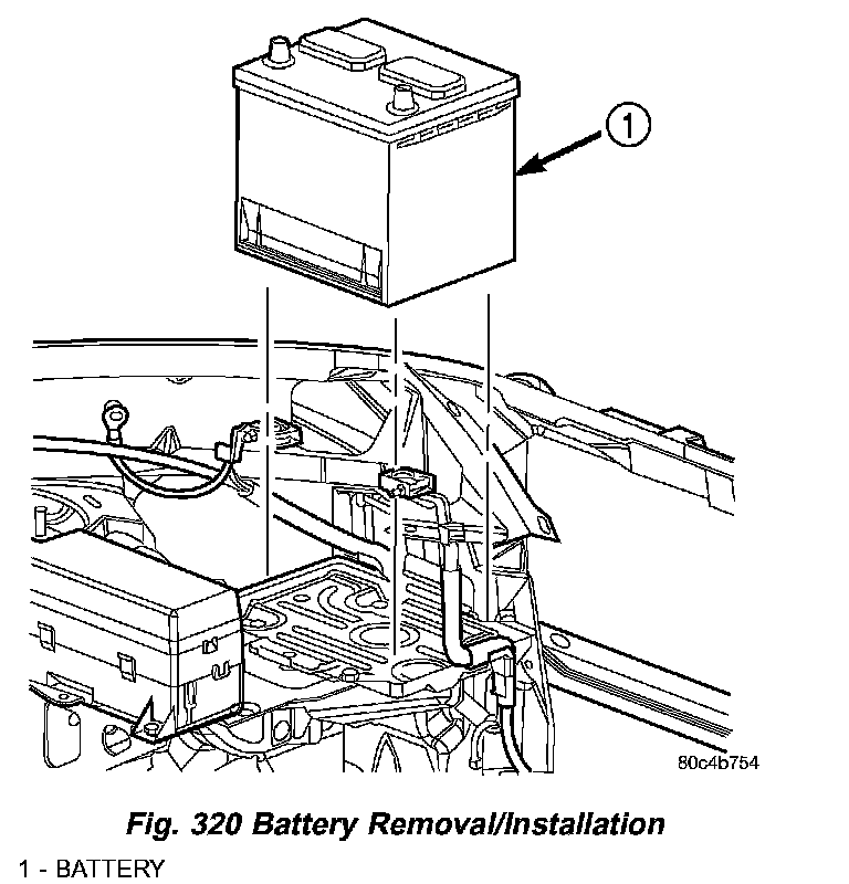 3. Remove the battery hold down clamp and remove the battery (Fig. 320).