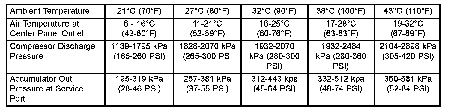 6. With the A/C compressor clutch engaged, compare the air temperature at the center panel outlet and the compressor discharge pressure to the A/C Performance Temperature and Pressure chart. The compressor clutch may cycle, depending upon the ambient temperature and humidity. If the clutch cycles, use the readings obtained before the clutch disengaged.