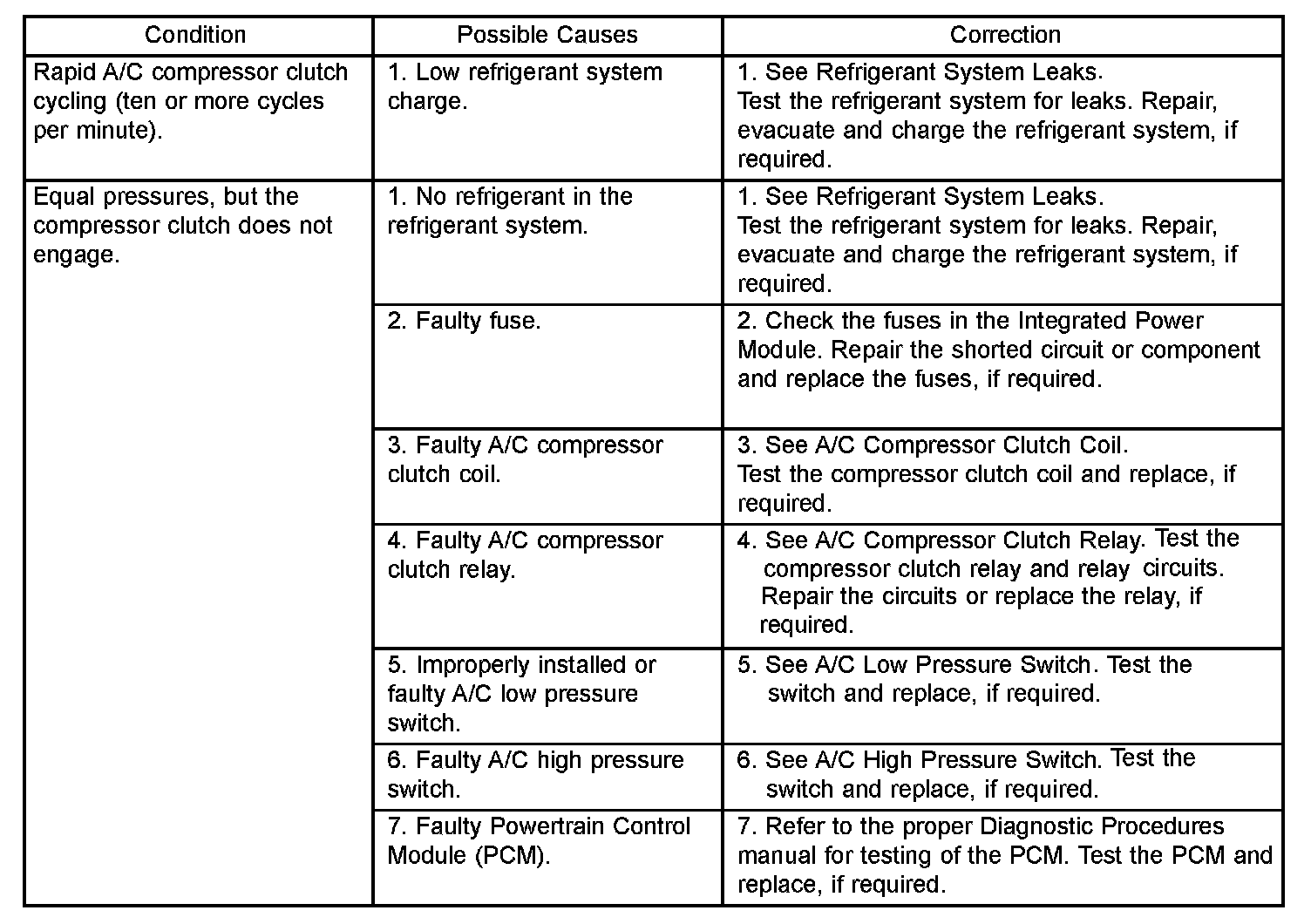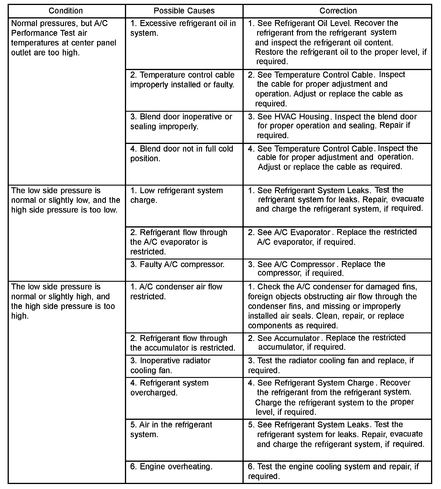 7. If the air outlet temperature fails to meet the specifications in the A/C Performance Temperature and Pressure chart, or if the compressor discharge pressure is high, refer to the A/C Pressure Diagnosis Chart.