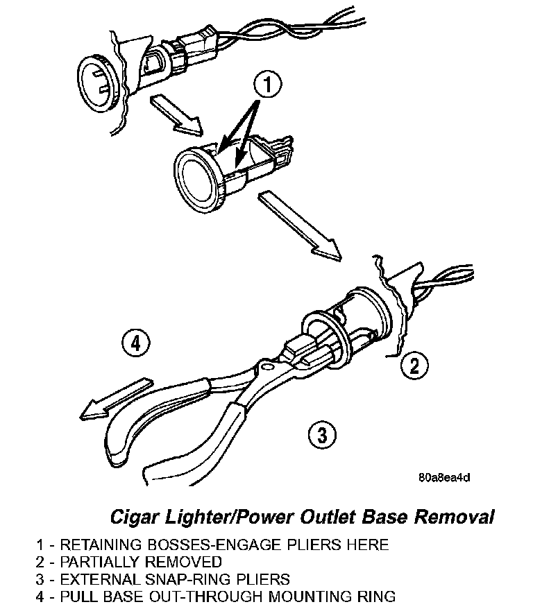 This procedure applies to the Front Console and Rear Cargo Area mounted outlets on this vehicle. If the instrument panel mounted cigar lighter/power outlet is defective, the entire accessory switch bezel must be replaced.