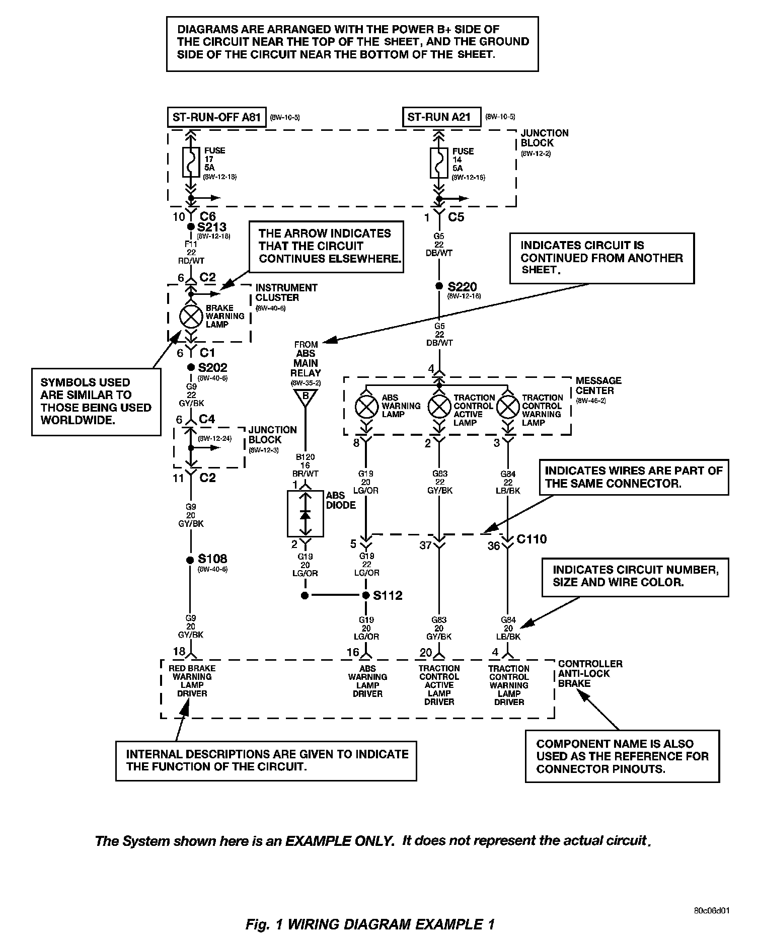 Diagrams are arranged such that the power (B+) side of the circuit is placed near the top of the sheet, and the ground (B-) side of the circuit is placed near the bottom of the sheet (Fig. 1).