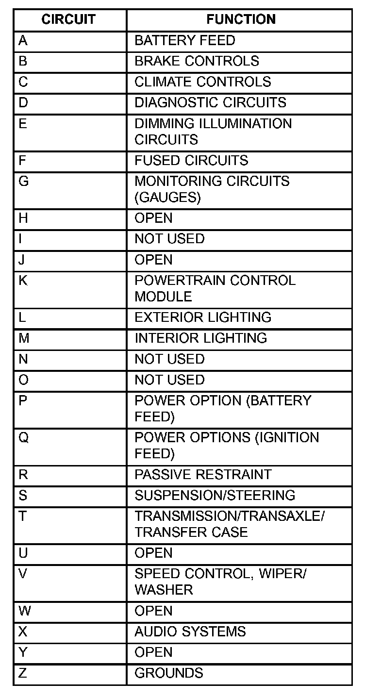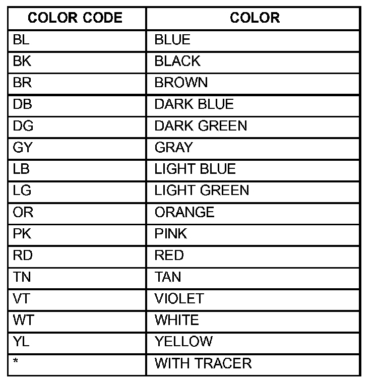 All circuits in the diagrams use an alpha/numeric code to identify the wire and it's function. To identify which circuit code applies to a system, refer to the Circuit Identification Code Chart. This chart shows the main circuits only and does not show the secondary codes that may apply to some models.