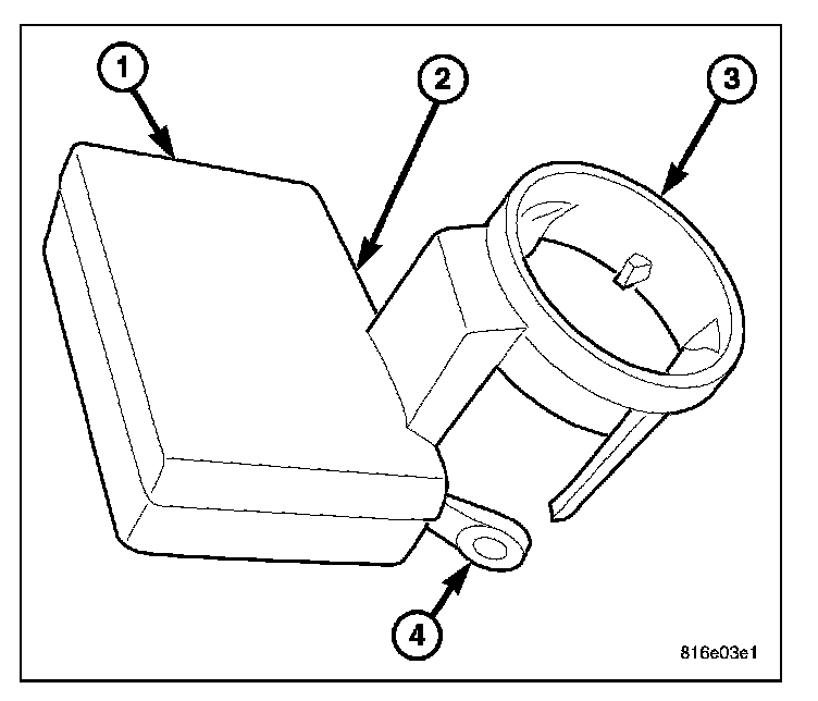A single connector (1) is located next to the antenna ring on the SKREEM/WCM housing. A molded plastic mounting tab (2) on the SKREEM/WCM housing secures the unit to the steering column. The SKREEM/WCM is connected to the vehicle electrical system through the instrument panel wire harness. The SKREEM/WCM cannot be adjusted or repaired. If faulty or damaged, the entire SKREEM unit must be replaced.