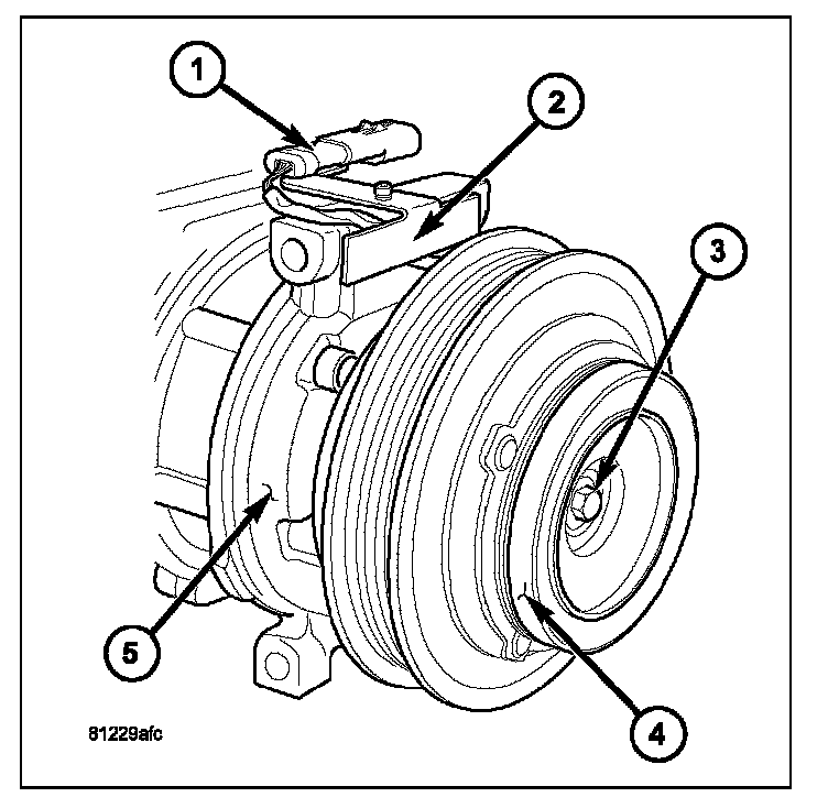 6. Install the clutch plate (4) onto the front of the A/C compressor (5).