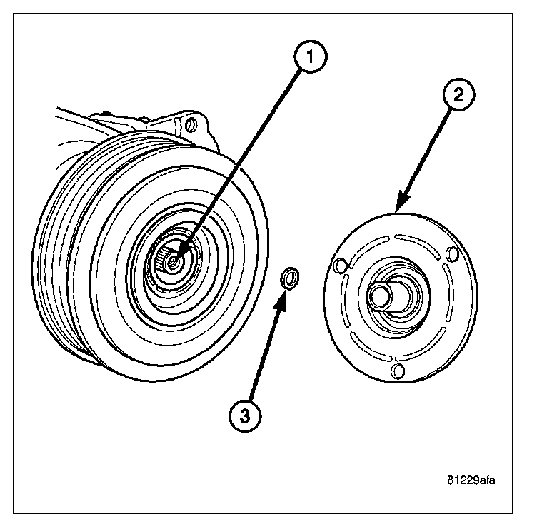 5. If the original clutch plate (2) and pulley and bearing assembly are to be reused, reinstall the original shim(s) (3) onto the compressor shaft (1). If a new clutch plate and pulley and bearing assembly are being used, install a trial stack of shims 2.54 mm (0.010 in.) thick onto the compressor shaft.