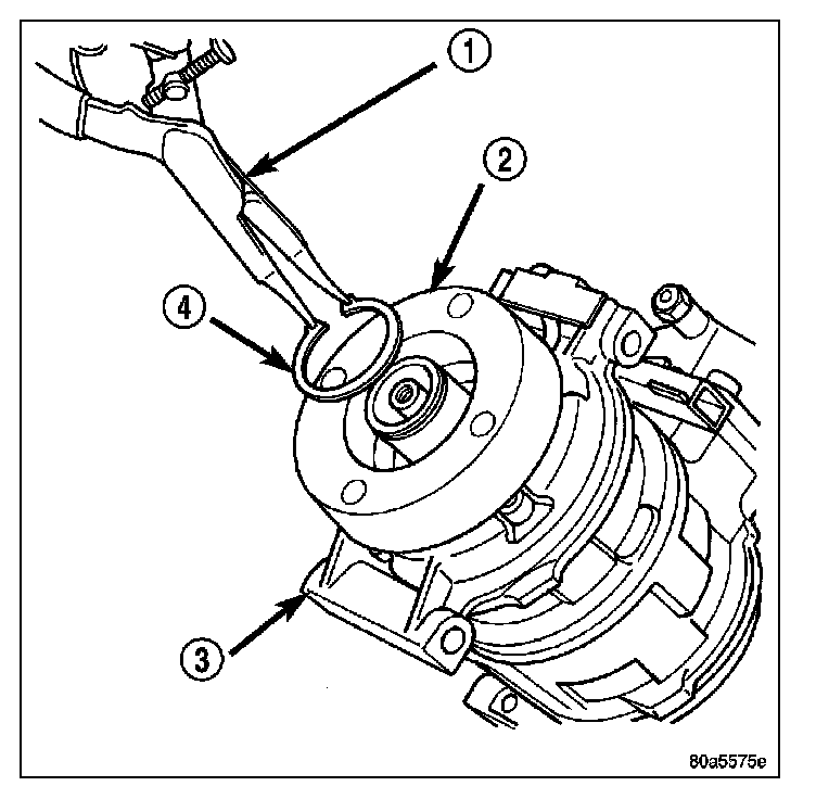 10. Using snap ring pliers (1), remove the snap ring (4) that secures the compressor clutch field coil (2) to the front of the A/C compressor (3) and remove the field coil.