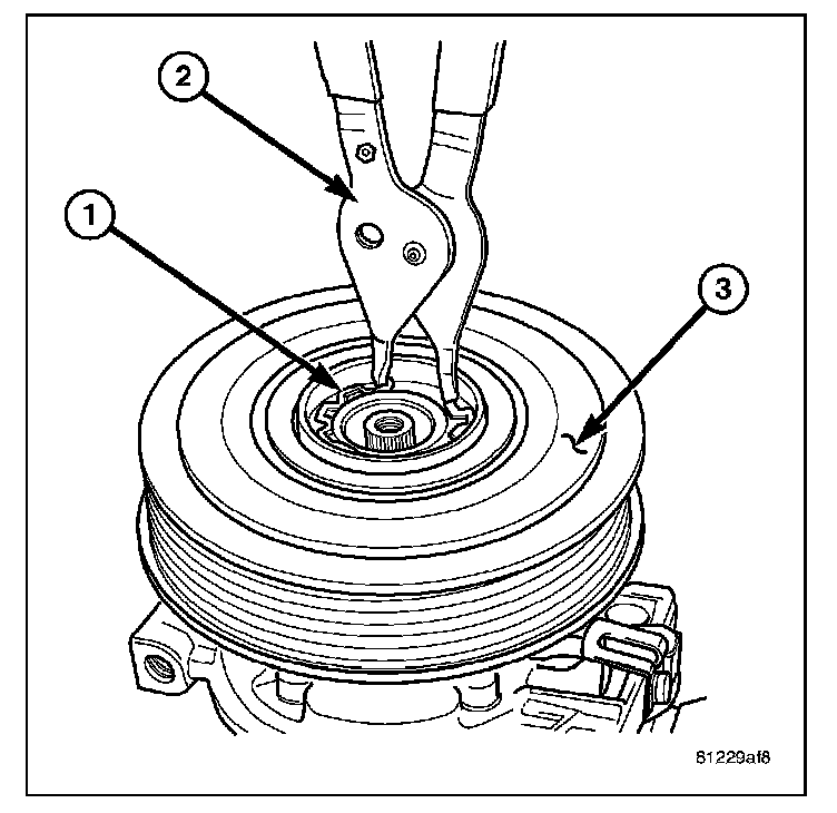 4. Using snap ring pliers (2), install the snap ring (1) that secures the pulley and bearing assembly (3) to the front of the A/C compressor. Be certain that the snap ring is fully and properly seated in the groove.