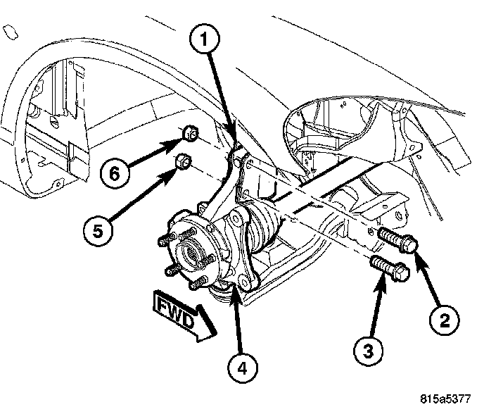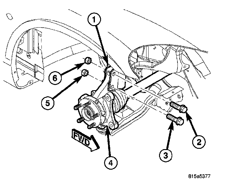3. Remove the original upper bolt (2) and nut (6) attaching the strut clevis bracket (1) to the knuckle (4).