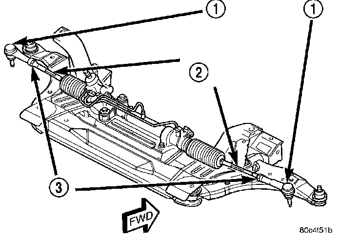 2. Loosen the tie rod adjusting jam nuts (3). Grasp each inner tie rod at its splines (2) and rotate it one way or the other until the front wheel toe is set to the preferred specification.