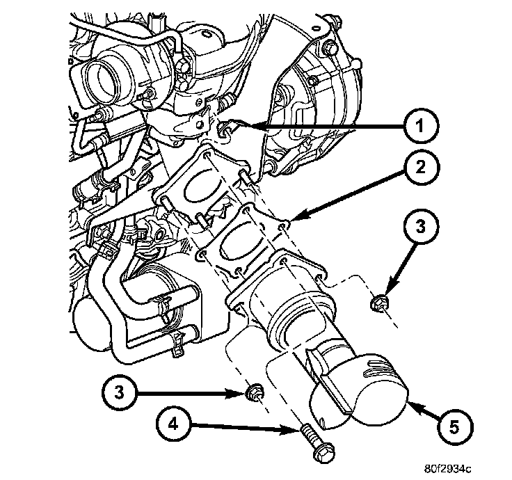 2. Tighten the catalytic converter (2) to exhaust manifold fasteners to 28 Nm (250 inch lbs.).