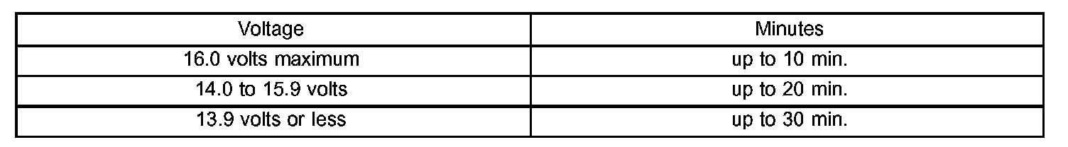 3. Battery chargers vary in the amount of voltage and current they provide. The amount of time required for a battery to accept measurable charging current at various voltages is shown in the Charge Rate Table. If the charging current is still not measurable at the end of the charging time, the battery is faulty and must be replaced. If the charging current is measurable during the charging time, the battery may be good and the charging should be completed in the normal manner.
