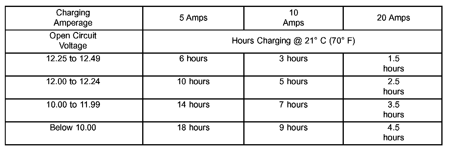 The Conventional Battery Charging Time Table gives an indication of the time required to charge a typical battery at room temperature based upon the battery state-of-charge and the charger capacity.