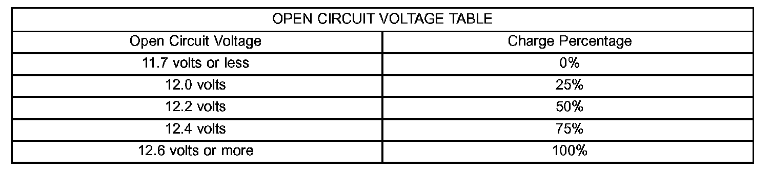 See the Open-Circuit Voltage Table. This voltage reading will indicate the battery state-of-charge, but will not reveal its cranking capacity. If a battery has an open-circuit voltage reading of 12.4 volts or greater, it may be load tested to reveal its cranking capacity.