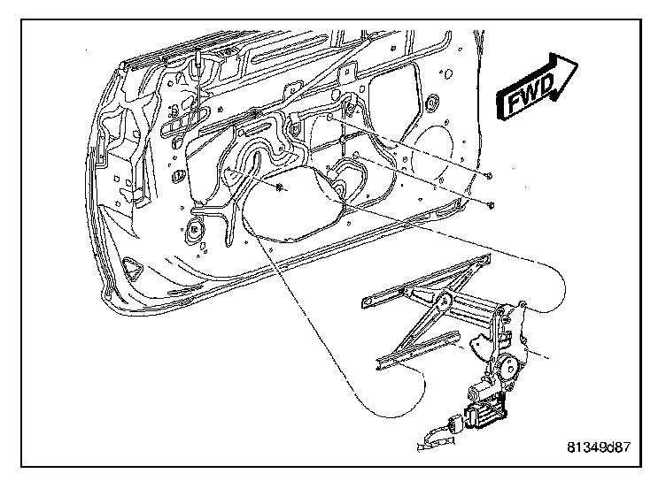The window regulator modules are directly connected to each of the front door window regulator motors. The window switches are hard wired by a mux circuit to the respective window regulator module. The respective rear window motor is hard wired to the module. The front window motor is directly attached to the module. Both front door window switches have the express down feature. The module will cease lowering the front glass when a fully down position is sensed through the hall effect sensor.