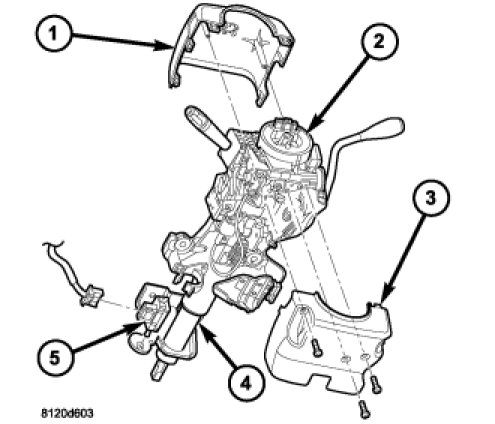 7. Position the upper shroud (1) onto the steering column over the lower shroud. On vehicles equipped with an automatic transmission, be certain to engage the gearshift lever gap hider into the opening in the right side of both shroud halves.