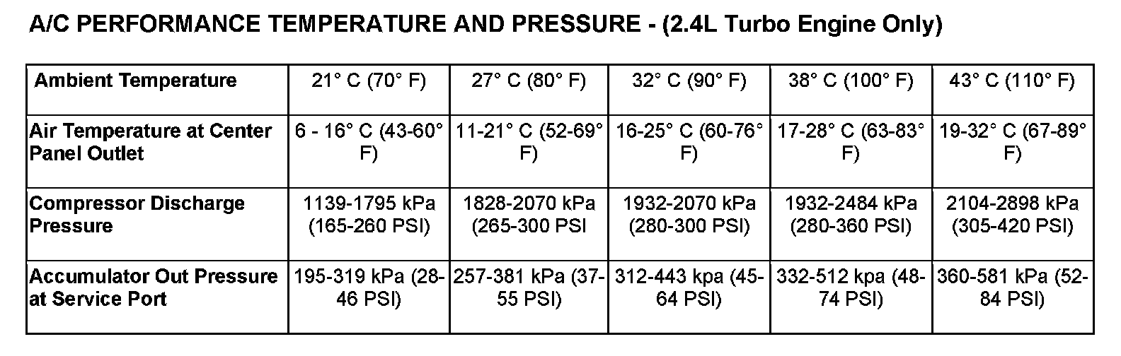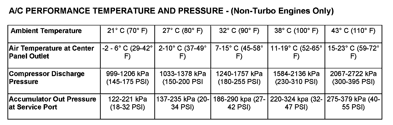 5. With the A/C compressor clutch engaged, compare the air temperature at the center panel outlet and the A/C compressor discharge pressure (high side) to the A/C Performance Temperature and Pressure chart. The compressor clutch may cycle, depending upon the ambient temperature and humidity. If the clutch cycles, use the readings obtained before the clutch disengaged.