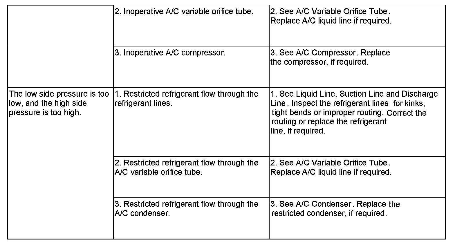 6. If the air outlet temperature fails to meet the specifications in the A/C Performance Temperature and Pressure chart, or if the A/C compressor discharge pressure is high, refer to the A/C System Diagnosis chart.