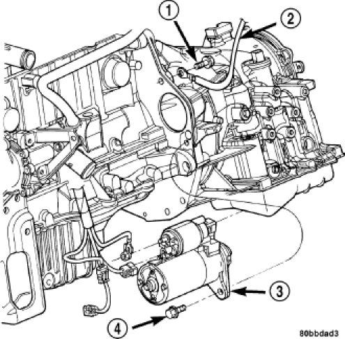 7. Remove starter motor mounting bolts .