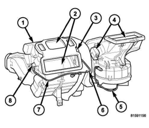 All vehicles are equipped with a common heater, ventilation and air conditioning (HVAC) housing (1). The heating-A/C system combines heating, ventilating and A/C (if equipped) capabilities in a single HVAC housing mounted within the passenger compartment beneath the instrument panel. The HVAC housing includes: