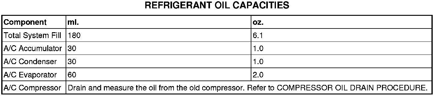 Refrigerant oil must be added when an A/C accumulator, A/C condenser or A/C evaporator is replaced. See the Refrigerant Oil Capacities chart.