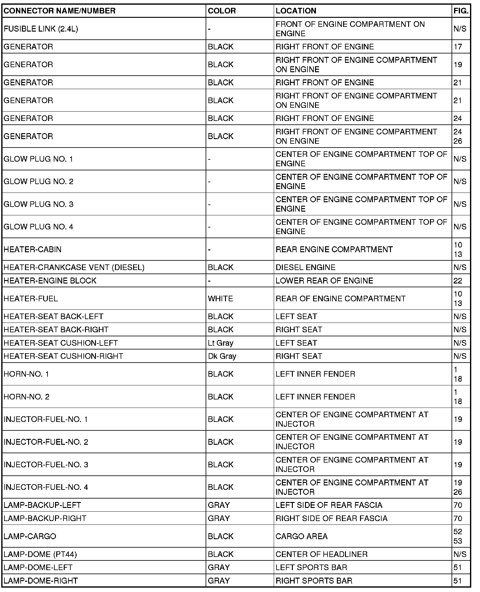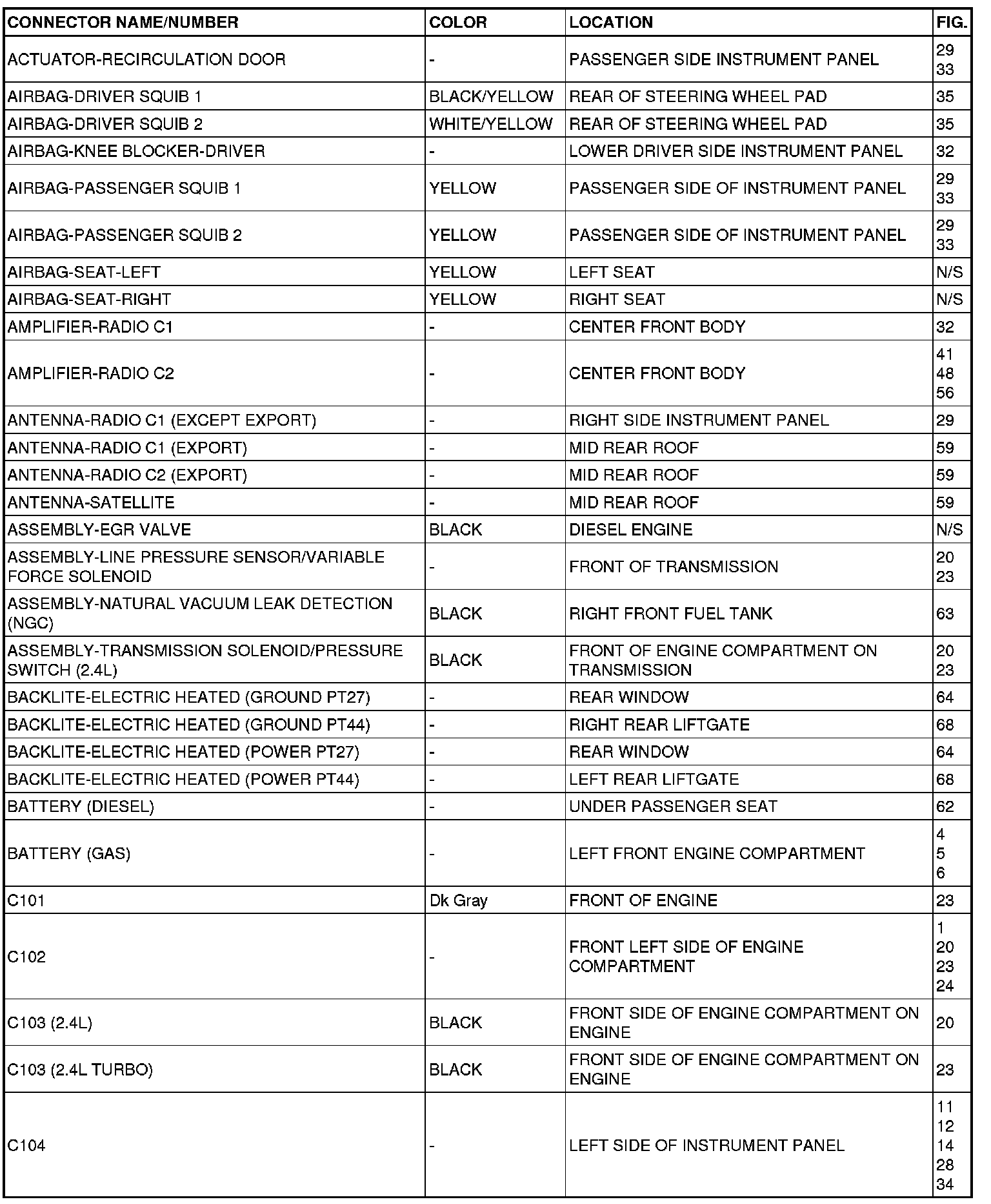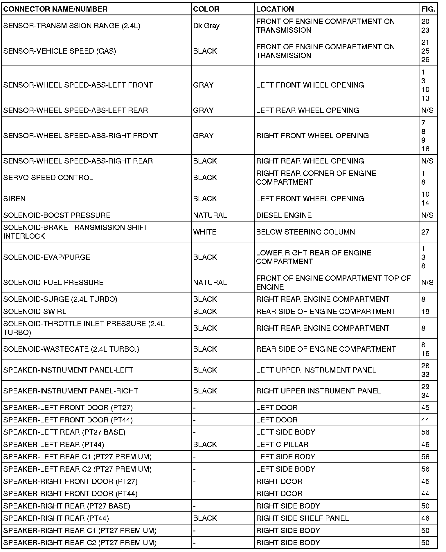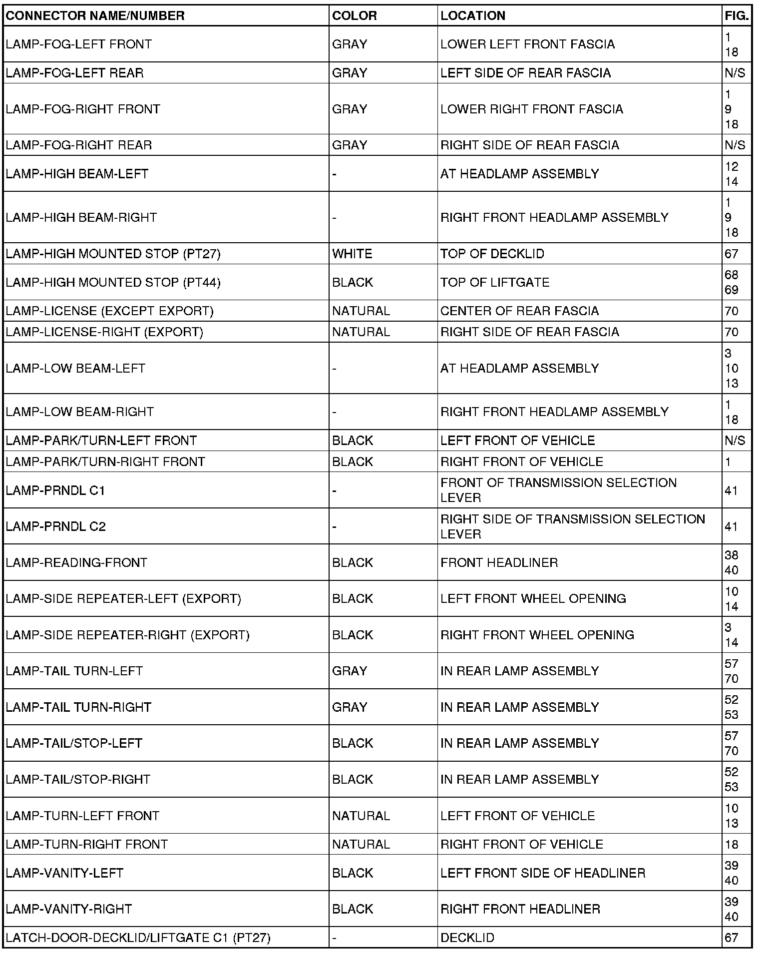 This section provides illustrations identifying connector, ground and splice locations in the vehicle. Connector, ground and splice indexes are provided. Use the wiring diagrams in each section for connector, ground and splice identification. Refer to the appropriate index for the proper figure number. For items that are not shown in this section N/S is placed in the Fig. column.