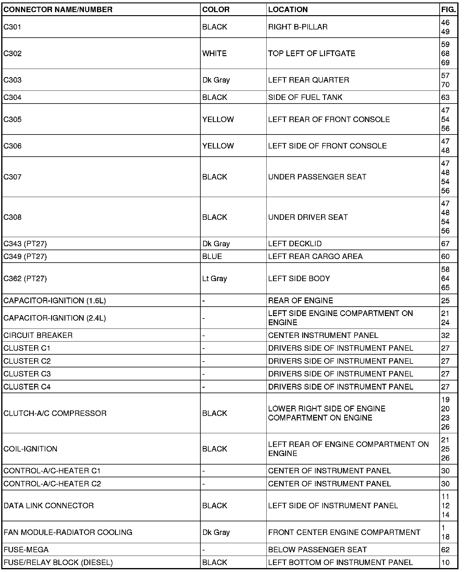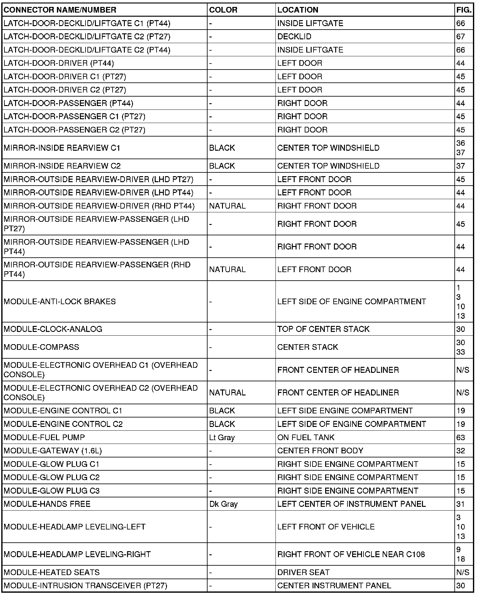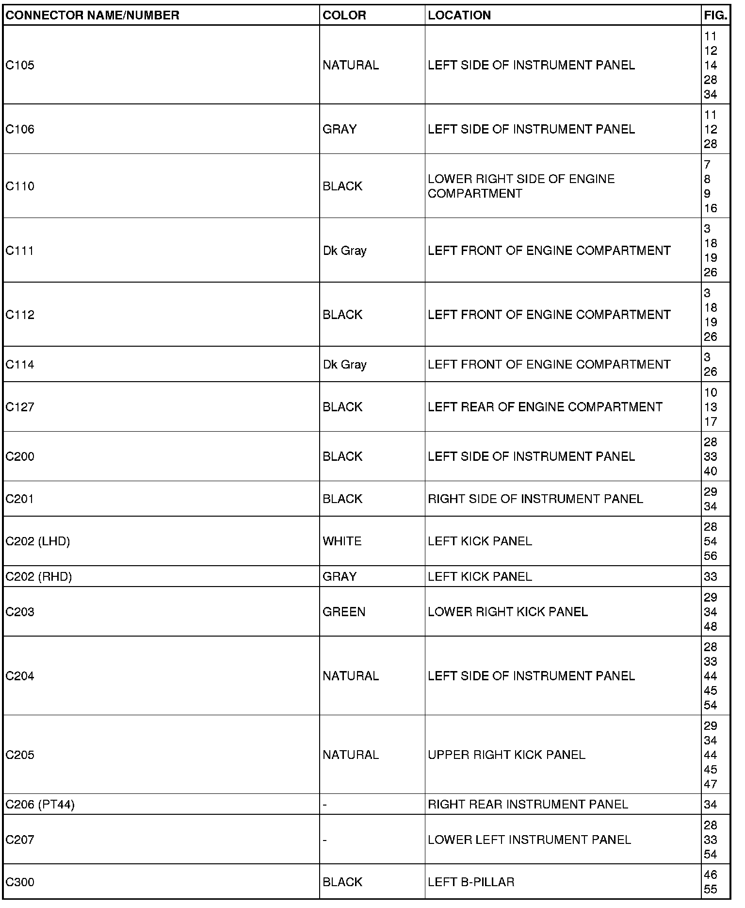 This section provides illustrations identifying connector, ground and splice locations in the vehicle. Connector, ground and splice indexes are provided. Use the wiring diagrams in each section for connector, ground and splice identification. Refer to the appropriate index for the proper figure number. For items that are not shown in this section N/S is placed in the Fig. column.
