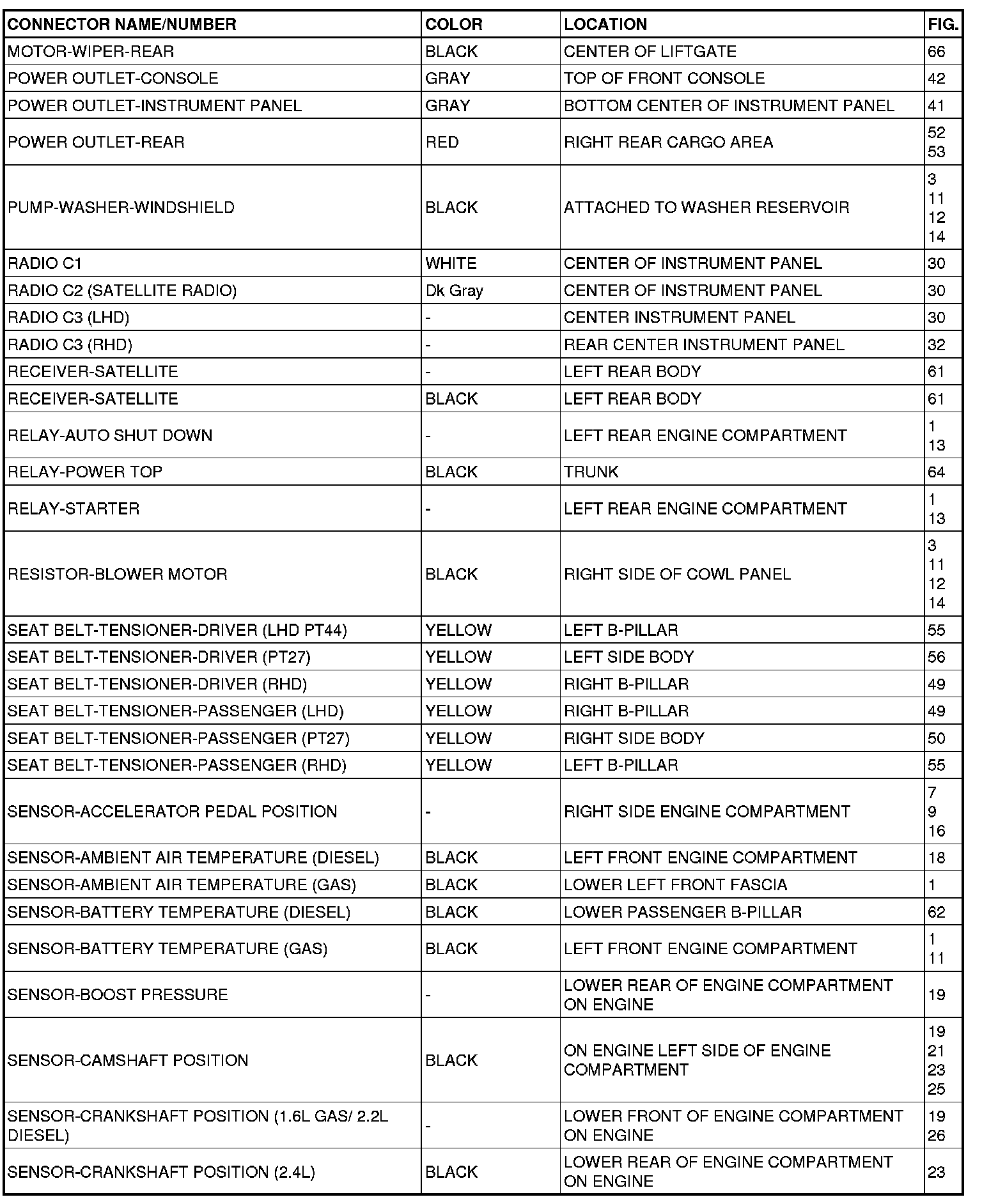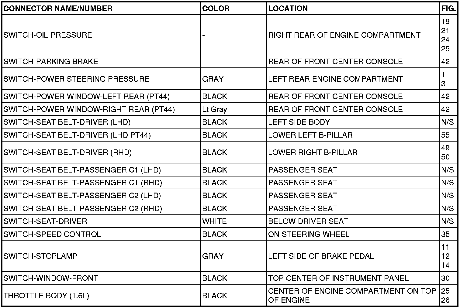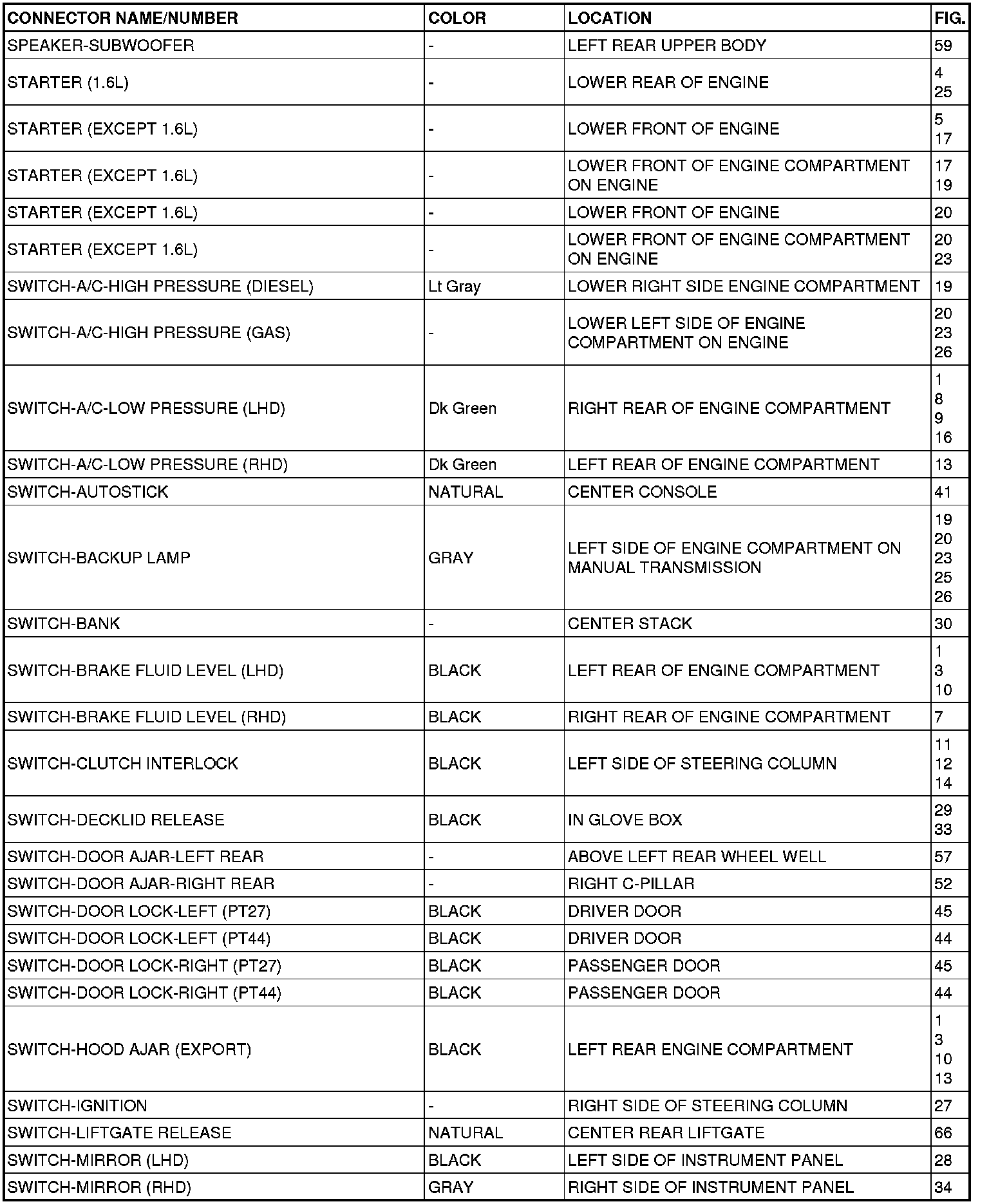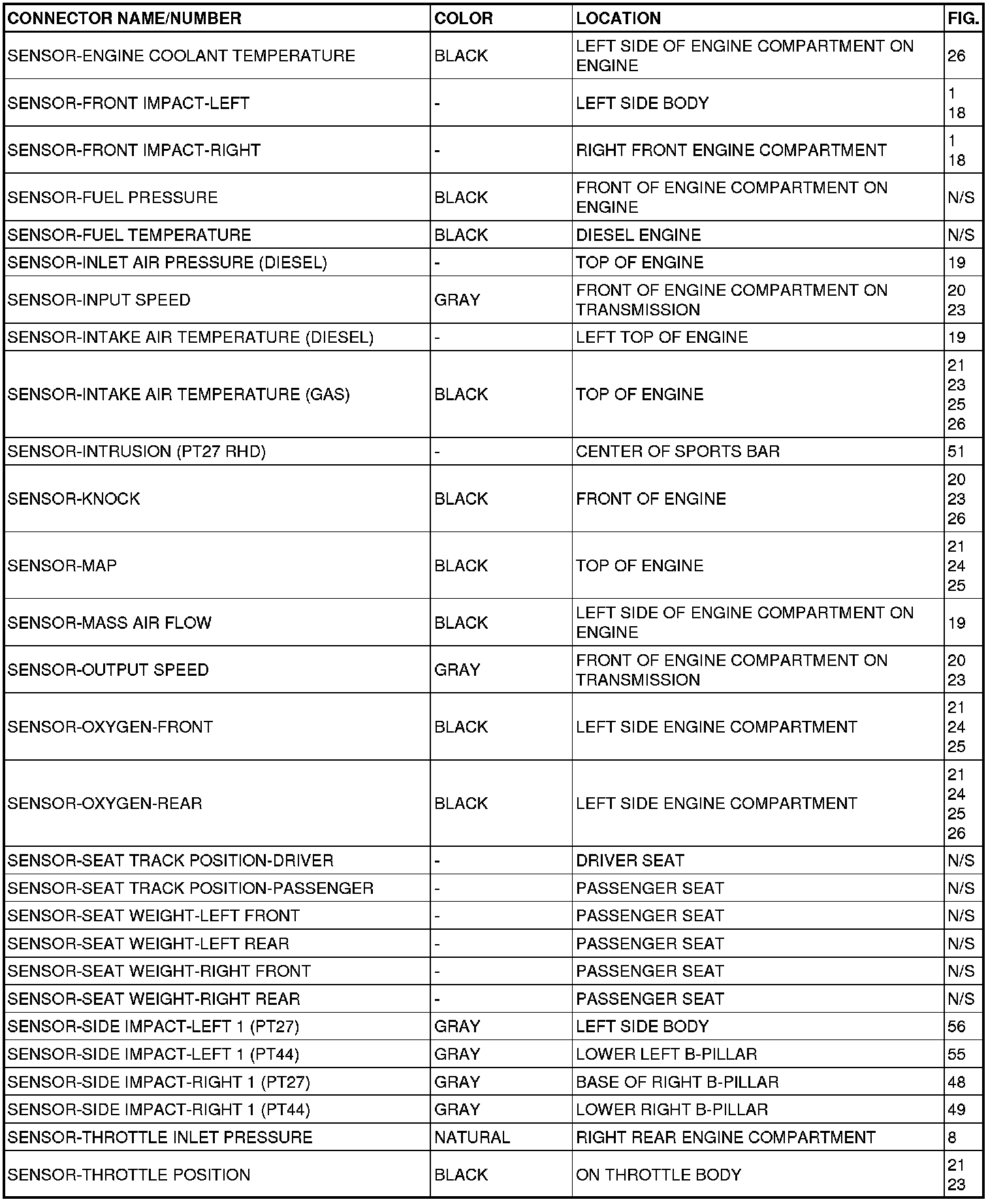 This section provides illustrations identifying connector, ground and splice locations in the vehicle. Connector, ground and splice indexes are provided. Use the wiring diagrams in each section for connector, ground and splice identification. Refer to the appropriate index for the proper figure number. For items that are not shown in this section N/S is placed in the Fig. column.