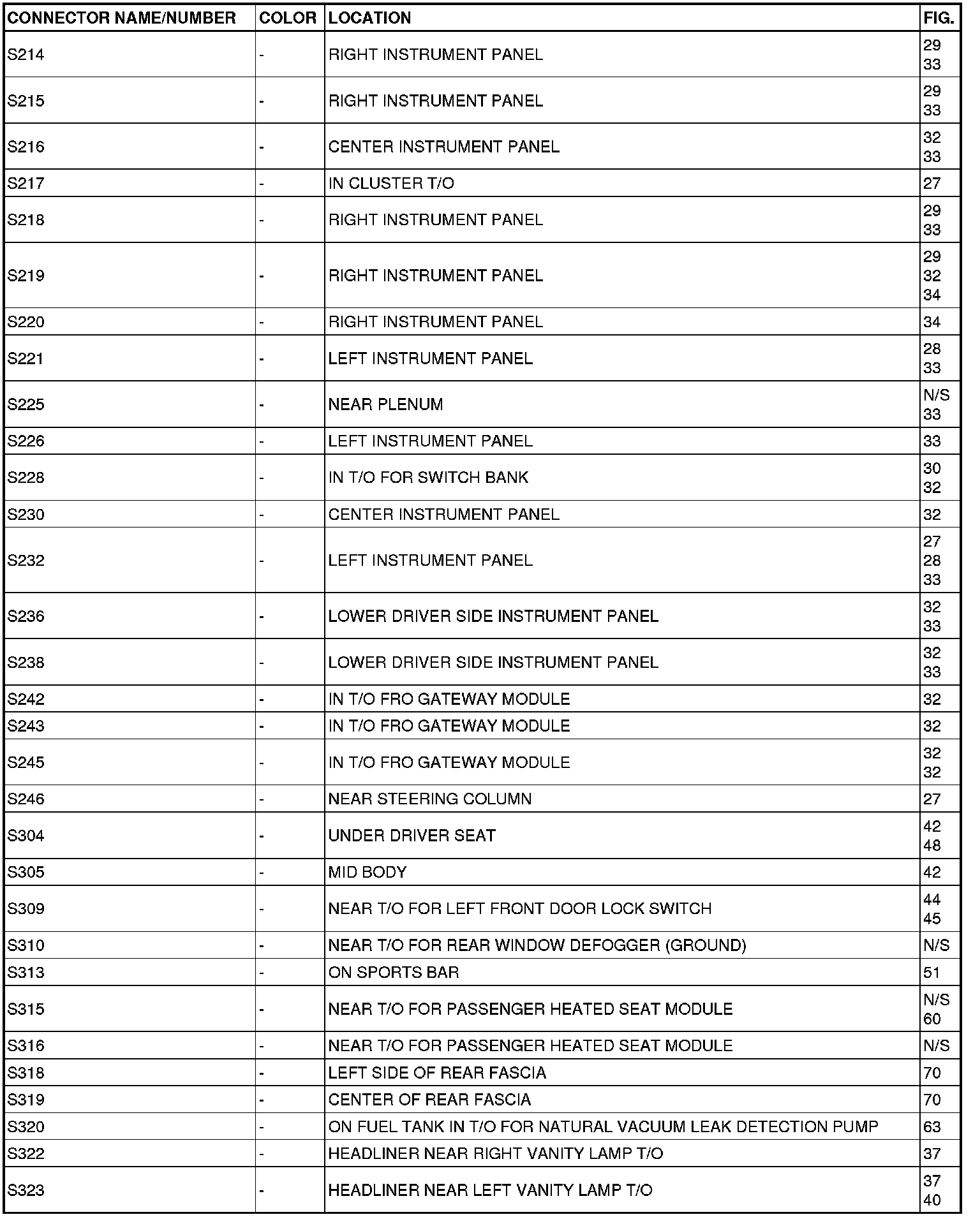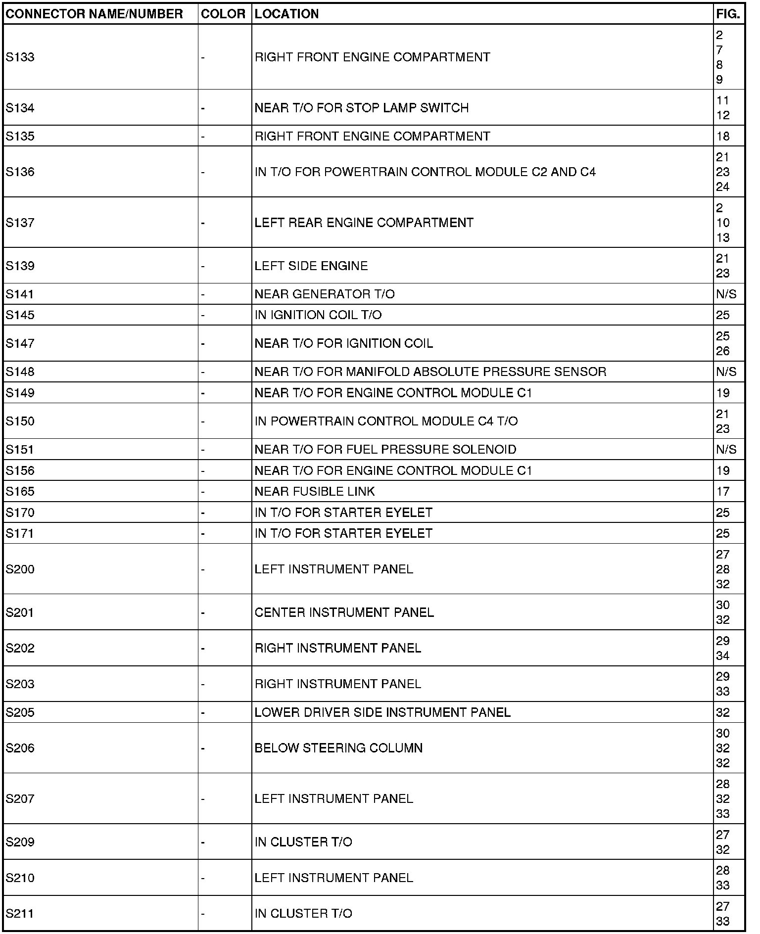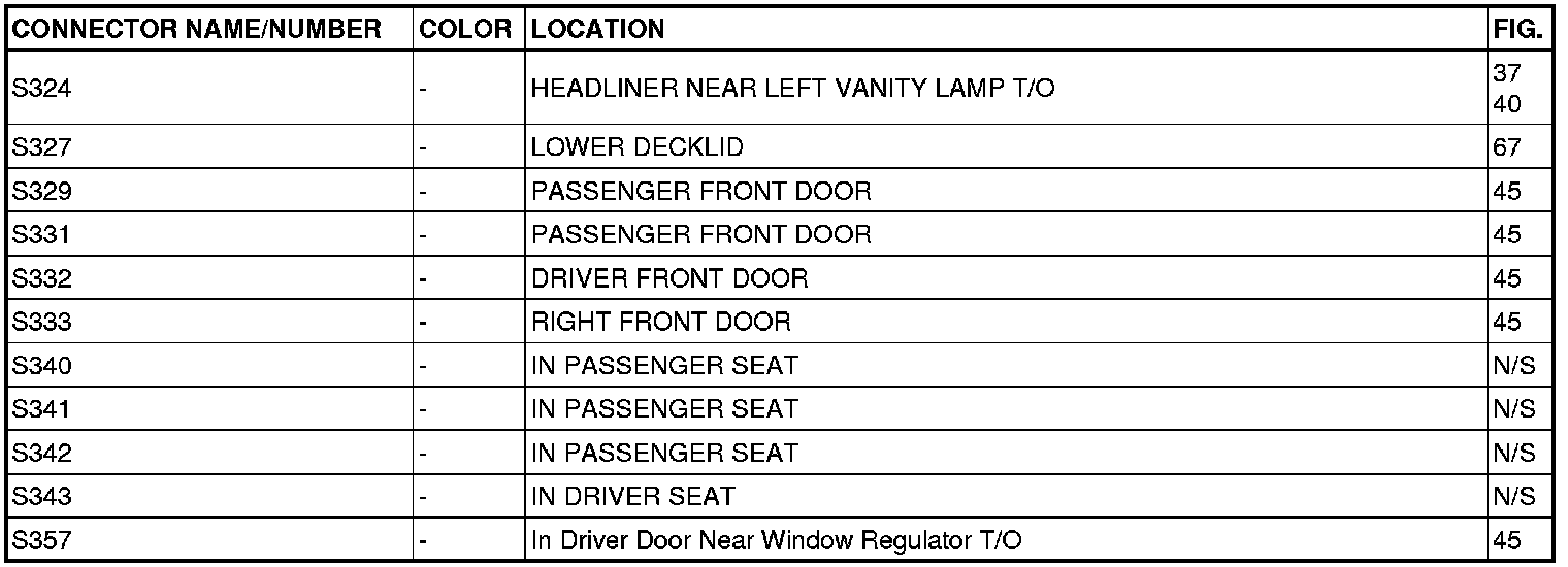 This section provides illustrations identifying connector, ground and splice locations in the vehicle. Connector, ground and splice indexes are provided. Use the wiring diagrams in each section for connector, ground and splice identification. Refer to the appropriate index for the proper figure number. For items that are not shown in this section N/S is placed in the Fig. column.