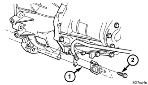 14. Re-install slave cylinder (1) into position. 1.6L equipped models: Torque slave cylinder to case bolt to 12 Nm (105 in. lbs.). 2.4L equipped models: Torque slave cylinder to case bolt to 19 Nm (168 in. lbs.).