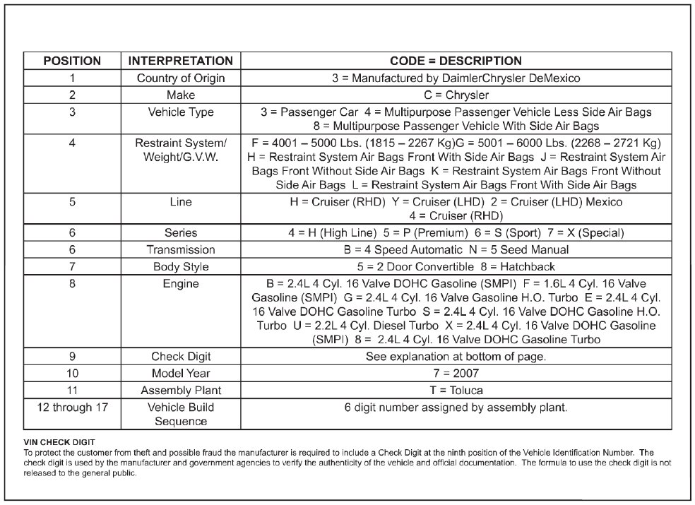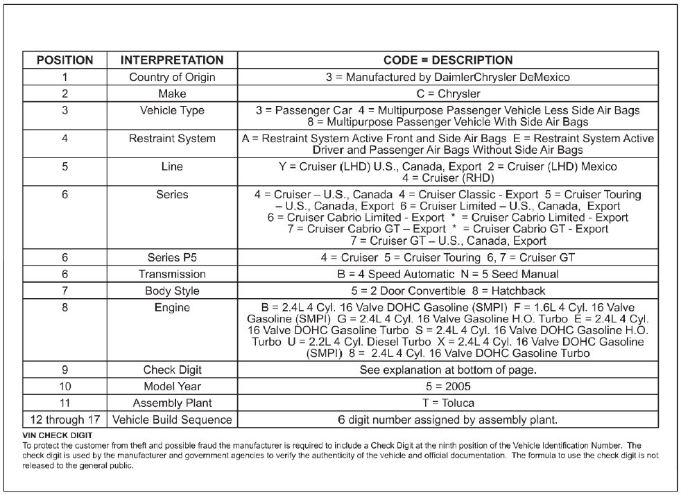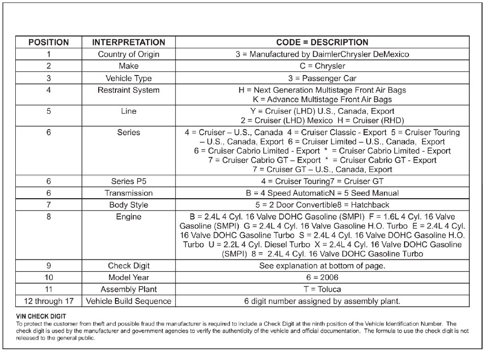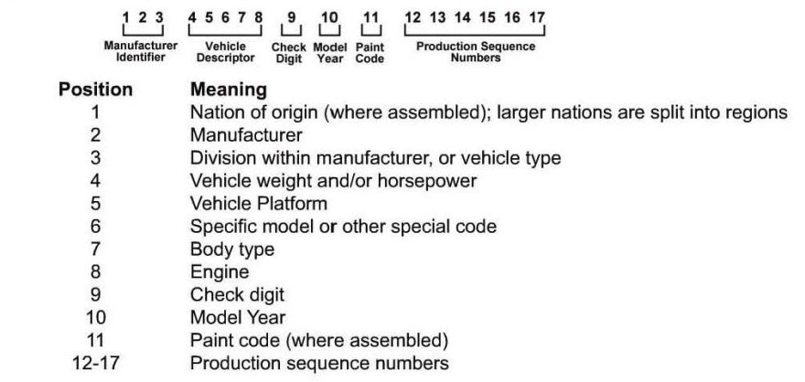 Vehicle Identification Number Decoding Chart