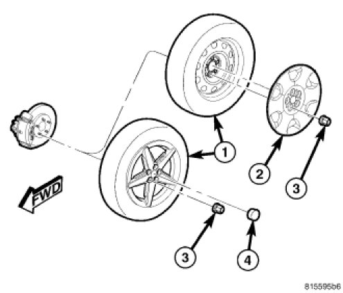 9. Install the tire and wheel assembly (1) Tires and Wheels - Installation. Install and tighten the wheel mounting nuts (3) to 135 Nm (100 ft. lbs.).